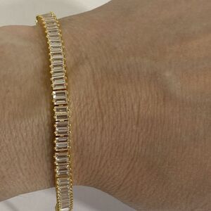 The Caitlyn Minimalist Handcrafted Cubic Zirconia Gold Tennis Bracelet is a beautifully crafted piece of jewelry perfect for various occasions such as Mother's Day, Christmas, graduations, anniversaries, birthdays, and Valentine's Day. Made with high-quality gemstones and cubic zirconia stones, this bracelet features a stunning design with a lobster closure for easy wear. The yellow gold plated metal adds a touch of elegance to the piece, making it a timeless accessory for any fashion-forward individual looking for a beautiful and adjustable bracelet to add to their collection.