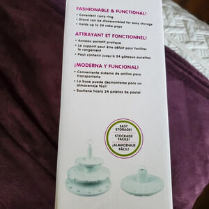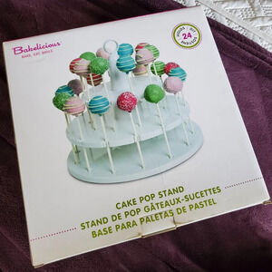 Like new, 2 tierd, stand holds 24 cake pops or lolipops, includes cake pop sticks.