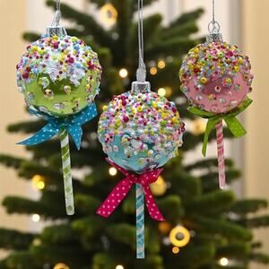Cake Pops Set/3 Ornaments Glass Pink Blue Green Beaded Christmas Spiral Stick