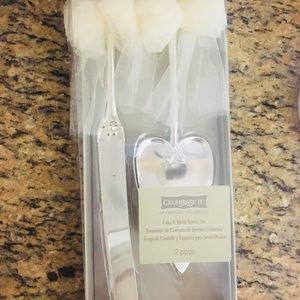 “Celebrate It” cake and knife server set. Used once. Couple spots on knife. Decorative ivory color tulle bows added.