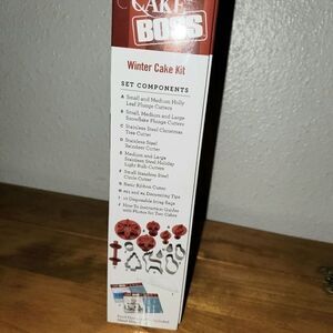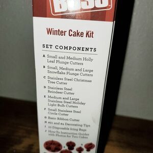 Winter Cake Kit includes 25 pieces -- leaf and snowflake plunge cutters, stainless steel trim reindeer circle and holiday light bulb cutter, ribbon cutter, decorating tips, icing bags, how to instructions