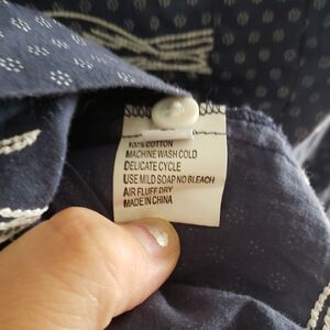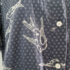 Overall good preowned condition some minor fading or wash wear noted from normal use beautiful white Embroidered birds on blue background. Button down front with button detail on sleeves
