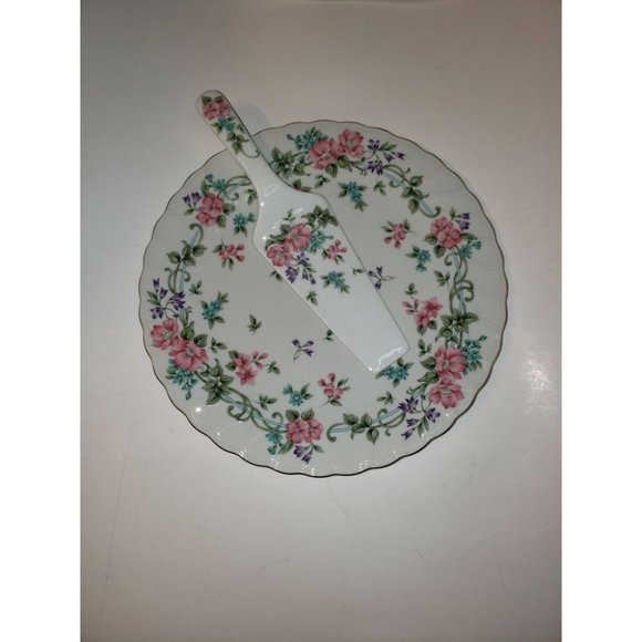 Beautiful cake or pie serving platter with knife. 9" diameter. Floral pattern on both pieces. Platter has a delicate gold trim piped on the edges. Both platter and knife are made of porcelain and are in pristine condition.... Never used....No scratches or cracks. Items made in Japan and bottom of plate reads Made Expressly for Federated Department Stores (now known as Macy's Inc.) No box, however items will be packaged carefully for safe shipping and handling.