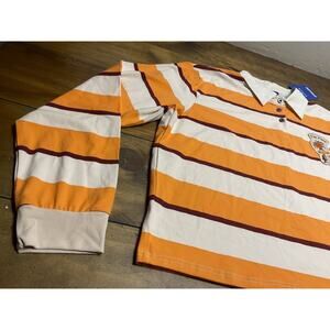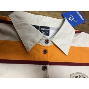 The Cakeworthy Inside Out Shirt for women in XL size features a vibrant orange color with a striped pattern inspired by the popular Disney Pixar movie. This long sleeve polo shirt has a collared neckline and regular fit, making it comfortable and stylish for everyday wear. The cartoon theme and high-quality knit fabric from Cakeworthy add a fun and nostalgic touch to any outfit, perfect for fans of the animated film.brand new we ship fast measurements are in the pictures