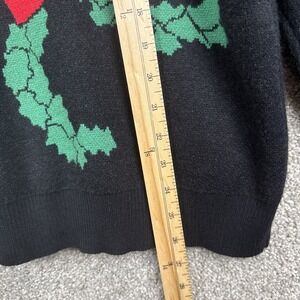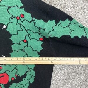 The Cakeworthy X Disney Nightmare Before Christmas Cardigan is an oversized unisex small sweater featuring iconic characters from the Disney movie such as Jack Skellington and Zero. Made from a blend of polyester, nylon, and viscose, this black cardigan has a V-neckline, long sleeves, and button accents. The graphic print, character patches, and pockets add to the retro and holiday-themed design, making it a perfect choice for fans of art, Christmas, and Disney classics.