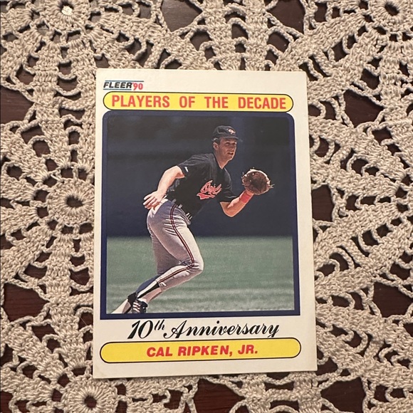Cal Ripken Jr. 10th Anniversary baseball card. Features action shot in uniform.