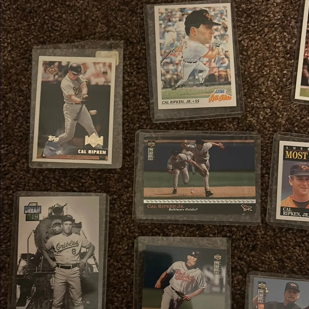 Collection of Cal Ripken Jr. baseball cards. Features various action shots and portraits.