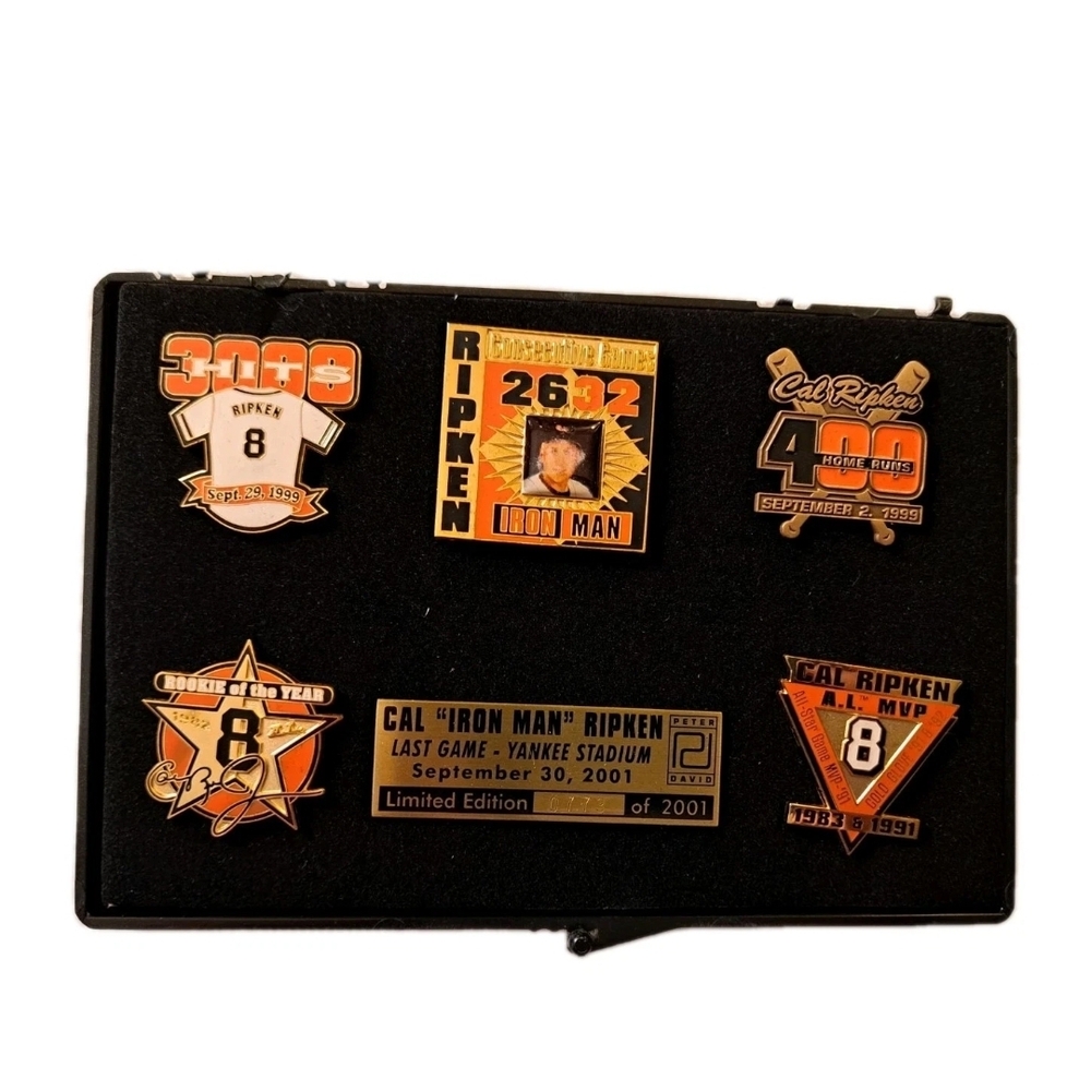 Rare 2001 Cal Ripken Jr. commemorative 5-pin set celebrating the Baltimore Orioles legend's final season. Officially licensed by Major League Baseball, this vintage memorabilia piece is a unique collectible item for fans of Cal Ripken Jr. and the Baltimore Orioles. Made in the United States, this original set from 2001 showcases the iconic player's association with the team and is a must-have for any baseball memorabilia collector.