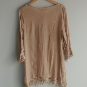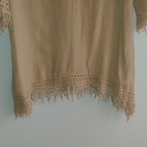 Long, tan top with lace sleeves, shoulder and hem. Size: large