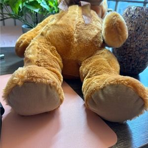 Meet this adorable golden brown cuddly monkey from CalPlush! Despite the window glare in its eye, this charming plush companion is in good pre-owned condition and comes adorned with a ribbon around its neck. Approximately 21 inches in size, this lovable monkey is perfect for snuggles and playtime. Originating from a smoke-free, pet-friendly home. The materials are polyester fibers and is for ages 3 and up.