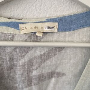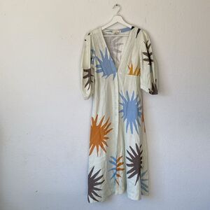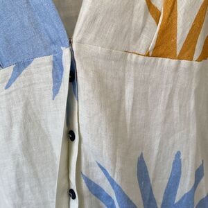 100% Linen, Pullover styling, Side pockets, Puff sleeves, V-neckline, A-line silhouette, Star Pattern, light stretch