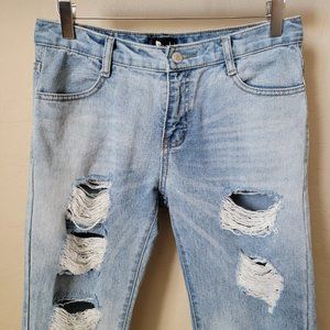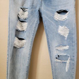 Cala boyfriend denim jeans, see measurements. Light wash blue denim. Mid rise. Distressed; destroyed. Raw, frayed hem. Whiskering. Non-stretch; not stretchy. Zipper and button fly closure. Size tag removed, see measurements. Casual. Streetwear. Boho. Hippie. Fall. Winter.