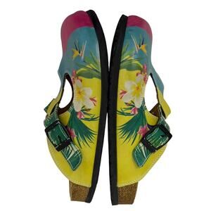 Calceo clogs, floral Mary Janes, hand painted shoes, comfort clogs, tropical print shoes, women’s size 38, artistic footwear, cork footbed clogs, colorful slip ons, boho casual shoes
