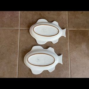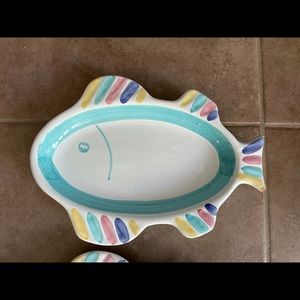 Caleca Fish Plates in Color Block. Measures 10”W, 7” H, 1” D. Hand painted from Italy. One of the plates has a chip on the tail (see picture). Beautiful pieces.