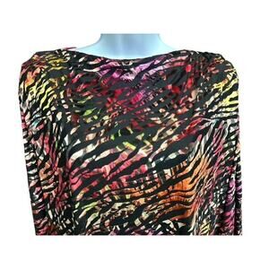 The Calessa 3X Top in Orange, Black, Red, and Crimson Multicolor Velvet Striped Stretch is a stylish and comfortable blouse perfect for travel and casual occasions. The tight boat neck and slightly gathered shoulder seams add a touch of elegance, while the pullover closure and lined interior provide a cozy fit. Made from a blend of spandex and elastane, this top offers a stretchy and flattering silhouette for plus-size women. The 3/4 sleeve length and vibrant multicolor stripes make it a versatile choice for the winter, fall, and spring seasons. The attached tag price is $59!