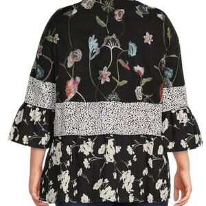 Calessa Black Embroidered Floral Patchwork Print 3/4 Sleeve Tiered Hem Tunic