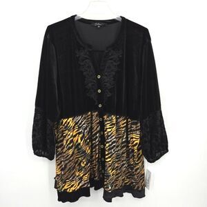 Calessa Womens Plus Size 3X Embroidered Velvet Burnout Tiered Patchwork Tunic Blouse Top Split V-Neck Animal Print Boho