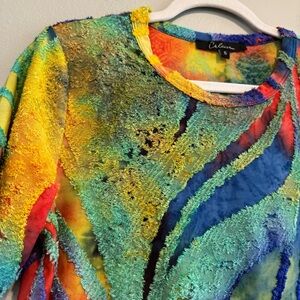 Vibrant women's top featuring a stunning abstract design. Perfect for adding a pop of color to your wardrobe.