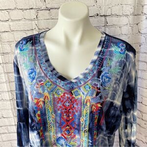 Calessa Embroidered Tir Dye Top tunic blouse 2X Blue White boho