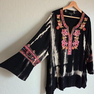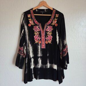 Calessa Floral Embroidered Tie Dye Tunic Black/Pink 3X Plus Bell Sleeve Bohemian