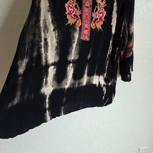 Calessa Bell Sleeve Bohemian Floral Embroidered Tie Dye Tunic Black/Pink Size Women's 3X Plus Split V-Neck Crinkle