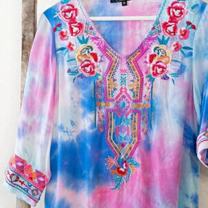 Calessa Tunic Top Size Medium Multicolor Tie Dye Boho Embroidered V-Neck Blouse