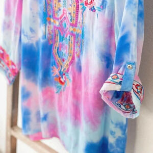 Calessa Tunic Top Size Medium Tie Dye VNeck Roll Tab Sleeves Embroidered
