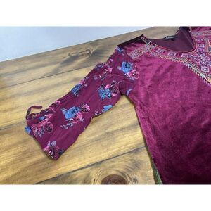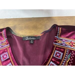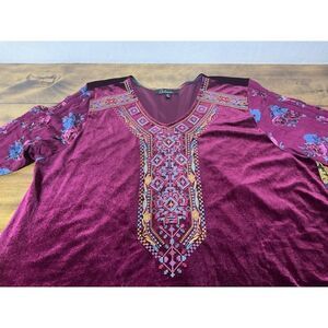 Calessa Velvet Embroidered Tunic Top Size 1x Burgundy Red Bell Sleeve VNeck Boho