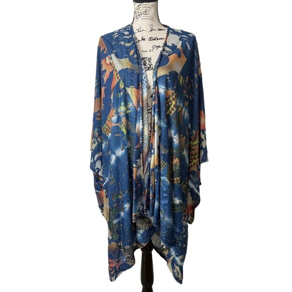 Calessa Womens Kimono Cardigan Burnout Blue Orange Artsy Open Front Size 3X