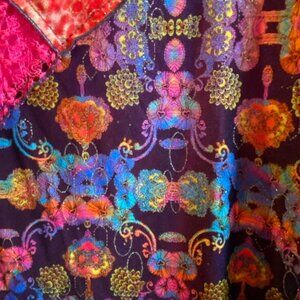 Brightly colored Calessa top for the summer. Bright pinks and blue printed materials make up a beautiful patchwork design. Sleeves are 3/4 length and are sheer. The main body of the shirt is lined. Material is a breeze to wear and maintain. New without tags. Item is stain, tear, etc free.