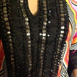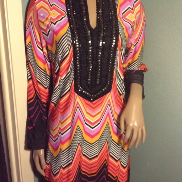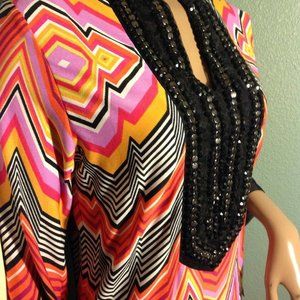This dress is made of 95% polyester and 5% spandex. It is brand new never been worn and ready to be one by you. The multi colors are vibrant and the beaded. Thank you for looking.