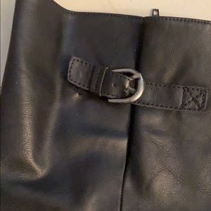 Gently used thigh high faux leather boots with accessory buckle and zipper
