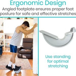 Vive Foot Rocker - Calf Stretcher for Achilles Tendinitis, Heel, Feet, Shin Splint, Plantar Fasciitis Pain Relief - Stretches Strained Leg Muscle - Ankle Wedge Stretch Improves Flexibility Safely and effectively stretch each foot, calf, and ankle with the Vive foot rocker. Ergonomically designed to promote proper foot posture, the foot stretcher gently and evenly stretches the foot to relieve foot pain, reduce fatigue and increase circulation and flexibility. The foot rocker can be used for feet of any size. Reducing foot pain from plantar fasciitis, Achilles tendonitis, ankle strain, arch pain, and other chronic conditions, the foot rocker encourages correct foot posture for effective stretching. Increasing range of motion and flexibility, the safe, even foot stretches also minimize heel, leg, and back discomfort. Packaging a bit bruised, but NIB.