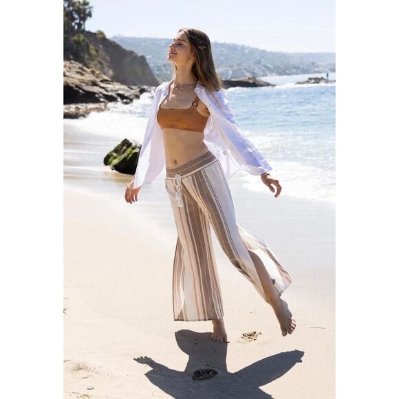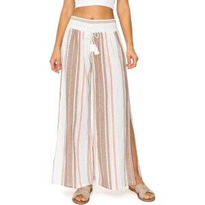 Cali 1850 Linen Cotton Pants Brown Cream Striped Slit Legs Size S Beachy Boho