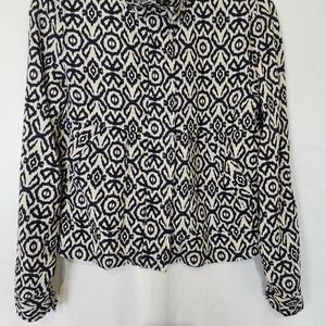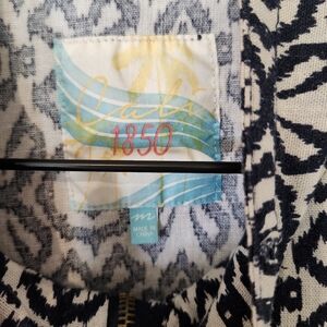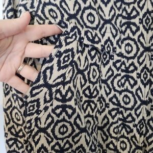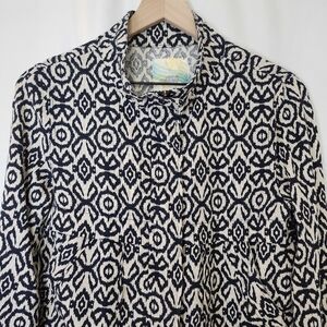 Cali 1850 Women's Linen Blend Jacket Size M Navy Tan Ikat Roll Tab Sleeve Spring