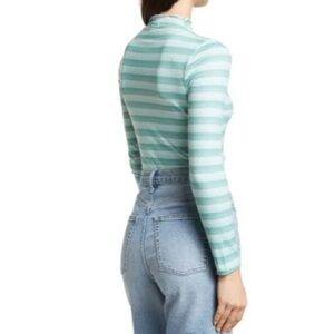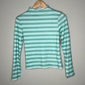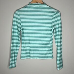 Cali Be Striped Ribbed Lettuce Mock Neck Long Sleeve Top Turquoise Size Medium