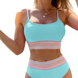 Cali Chic Women's Swimsuit Celebrity Sky Blue Striped Patchwork High Waist 2pcs Bikini HOT! NEW! Look Chic in this new arrival, athletic two-piece striped patchwork design bikini set with adjustable spaghetti straps and high waist design provide both comfort and support. The bikini is designed to provide a comfortable and flattering fit for women of different body shapes. All eyes will be focused on you. Just step out onto the beach, pool or on vacay and you will feel the rays coming from all directions looking at you with this NEW Cali Chic two piece swimsuit. Skin-friendly and quick-drying fabric. Material: 82% Nylon+18% Spandex. Top Quality!