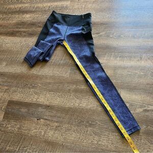 Calia by Carrie Underwood jacquard and mesh leggings. Black and royal blue/purple, size small. There’s a zipper pocket on the exterior front waistband. Material: 92% nylon, 8% spandex. Please see photo section for approximate flat measurements.