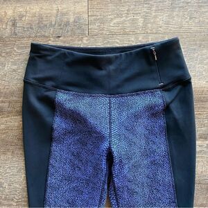 Calia by Carrie Underwood jacquard and mesh leggings. Black and royal blue/purple, size small. There’s a zipper pocket on the exterior front waistband. Material: 92% nylon, 8% spandex. Please see photo section for approximate flat measurements.