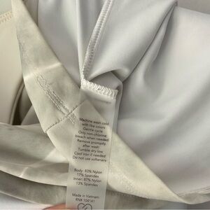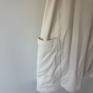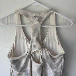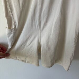 Racer back with small keyhole cutout. Built in romper with phone pocket. Built in bra with padding.