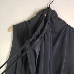 Key features: washed black color, sleeveless, drapey front with optional cinch