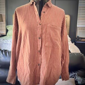 Calia Linen Blend Oversized Button-Up Shirt Brown White Stripe Long Sleeve M