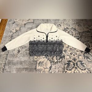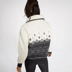 CALIA Women's Tipped 1/2 Zip Sherpa Pullover is a women's outerwear top featuring a 1/2 zip design, a tipped collar, and a soft sherpa fabric. Faux black leather trim and elastic hem. Please note, the top is missing the drawstring.