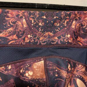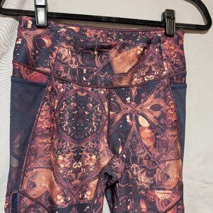 Calia capri length leggings featuring a tan, red-violet, purple, and navy blue colored design. Features navy blue sheer side pockets, navy blue sheer design at the bottom, subtle ladder detail running up the sides, and a hidden zippered pocket built into the front of the waistband.