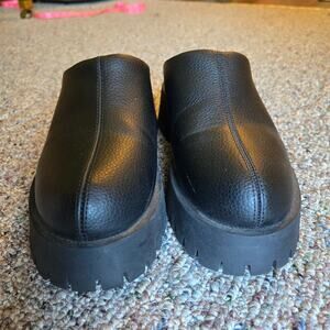 Black rubber chunky lug sole slip on clogs with rounded toe. Great used condition with some tiny scuffs as pictured. Inside fleece lining is looking good. Easy slip on and go shoes. Reviews say true to size. I'm a 7.5 and they were a smidge small so I would agree.