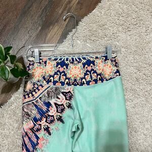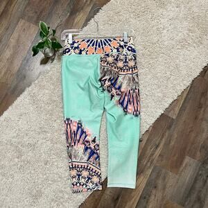 Mint green, multicolor boho pattern, capri length, mid rise, waistband zip closure pocket