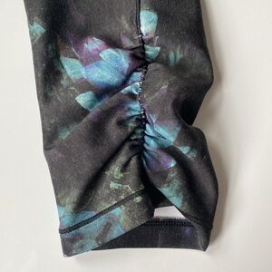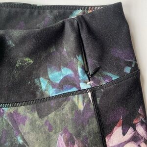 Calia core essential 3/4 cropped leggings with floral pattern featuring pink, purple, teal and black colors. Ruching at the calves makes these super flattering. Thick waistband with elastic detail holds you in. Zipper at waist to hold keys or earbuds. Piped hemline detail down the front and back. Size small.
