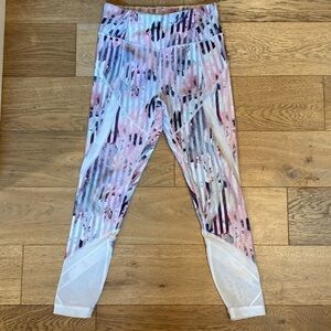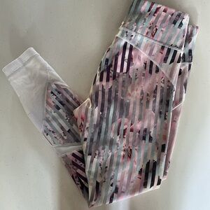Calia ankle length striped leggings with white mesh detail at calves. Front seam and asymmetrical side seams flatter and elongate the legs. Zipper at waist to hold keys or earbuds. Features light pink, gray, mint, dark pink and dark purple. Size small.