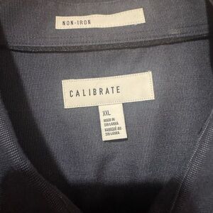 This is a modern men's short sleeve button-up shirt by Calibrate, featuring a non-iron fabric in a solid blue color. The shirt has two front chest pockets with button closures and is sized XXL. It appears to be a contemporary, casual style suitable for everyday or business casual wear.