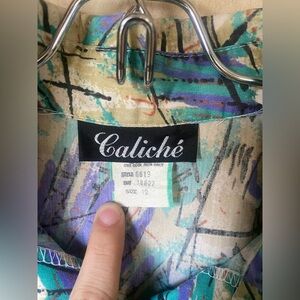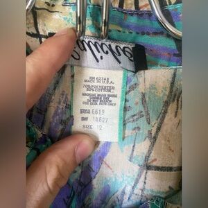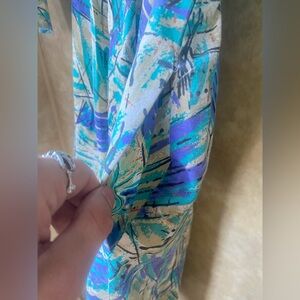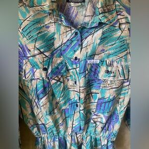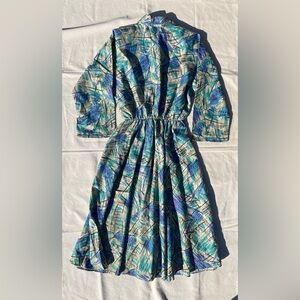 Stylish and vibrant, this teal, purple and tan patterned dress is perfect for any occasion. Fun and funky style, in good used condition. Dress has some structure, shoulder pads are still attached, button front, collared. Has pockets on both sides. Does not have a lot of stretch.